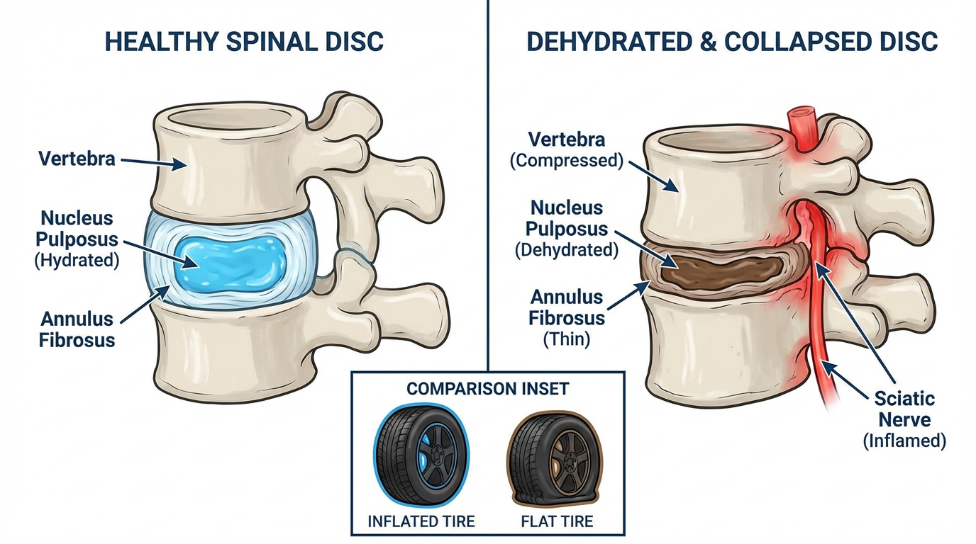 Your discs dry out from decades of compression (sitting, driving, slouching). Once dehydrated, they collapse crushing your sciatic nerve.